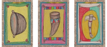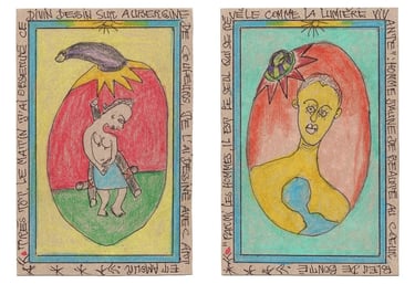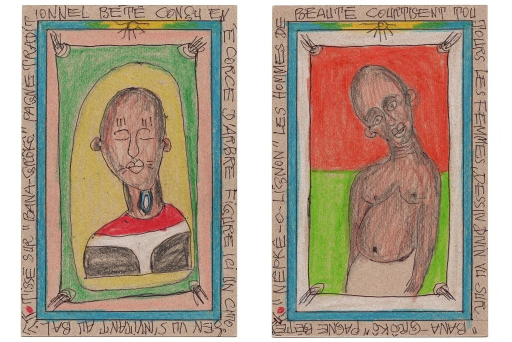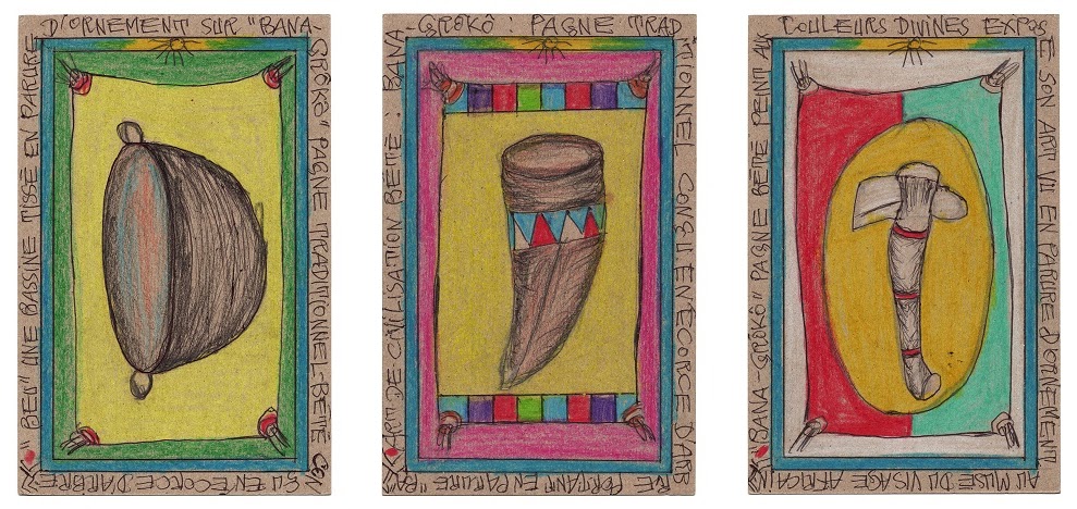 His philosophical reflections, rooted in African reality and the quest for the meaning of life, led him to produce an expansive series of small-scale drawings—postcard-sized works rendered in ballpoint pen and colored pencil. This series, titled Connaissance du Monde (Knowledge of the World), forms a kind of visual encyclopedia of universal knowledge and human experience.