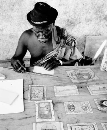 Su pensamiento filosófico, centrado en la realidad africana y en el sentido último de la vida, lo condujo a elaborar una vasta serie de dibujos en formato reducido —del tamaño de una postal— realizados con bolígrafos y lápices de colores. Esta serie, titulada Connaissance du Monde (El conocimiento del mundo), constituye una suerte de enciclopedia visual de saberes universales y experiencias humanas.
