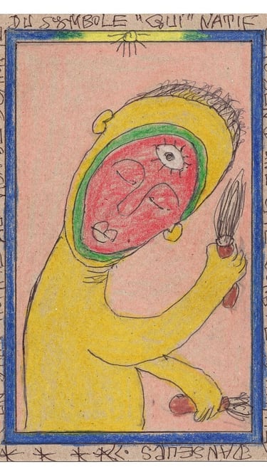 Frédéric Bruly Bouabré, nacido el 11 de marzo de 1923 en Zépréguhé, Costa de Marfil, vivió una revelación mística el 11 de marzo de 1948 que transformaría radicalmente el rumbo de su existencia. A raíz de esta epifanía, consagró su vida al arte, adoptando el nombre de Cheik Nadro, “el Revelador”. Falleció el 28 de enero de 2014, dejando tras de sí un legado singular como artista autodidacta, cuya creación trascendía lo visual para abarcar también la poesía, la filosofía y el ensayo.